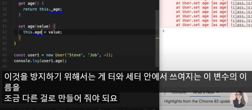 constructor 안에 있는 this.age는 메모리 안에 있는 this.age라는 값을 읽어오는 게 아니라, this의 메소드 .age()를 호출하게 된다.