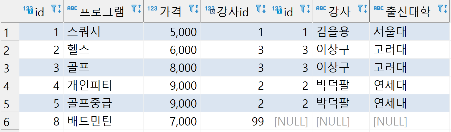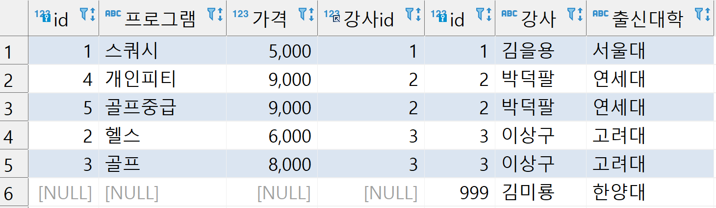 왼쪽 테이블의 모든 행이 출력되었고 왼쪽 테이블의 강사 id와 일치하는 오른쪽 테이블 행이 없는 경우는 NULL로 채워준다.
