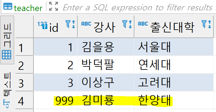 저번에 썼던 program, teacher 테이블에 행 1개씩 추가