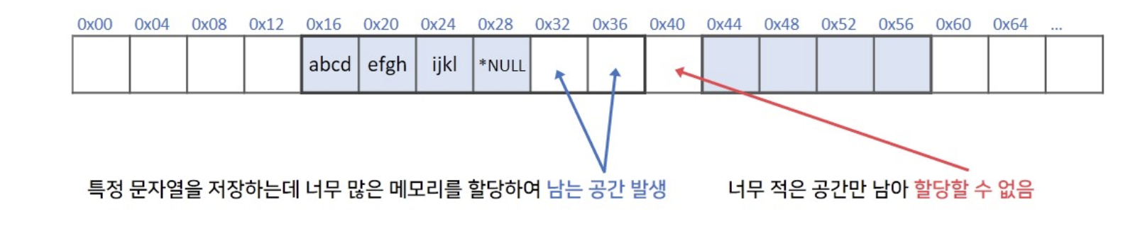 - 할당 요청을 만족시킬 수 있는 메모리 공간이 전체적으로 공간을 모았을 때는 충분한 크기가 존재하지만, 이 요청을 처리할 수 있는 단일한 가용블록이 없는 경우 발생한다.
