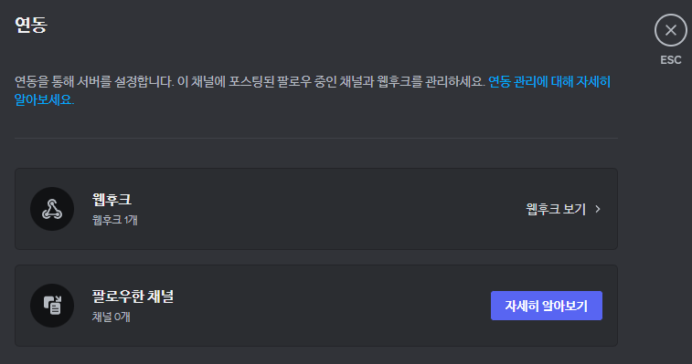 채팅 채널 편집의 연동 탭에 들어가면 웹후크라는 게 있다.