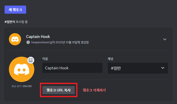 새 웹후크를 눌러 하나 만들어주고 URL이 필요하므로 복사 해주자.