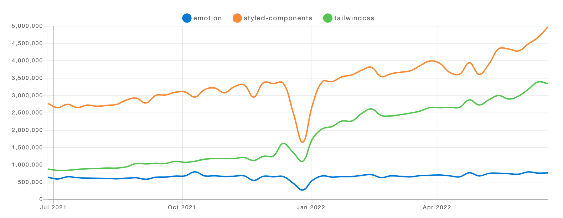styled-components외에도 다양한 패키지가 있지만, styled-components 예전부터 꾸준히 많은 개발자들에게 선택받은 패키지입니다.