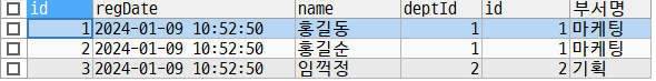 SELECT emp.*, dept.id, dept.name AS `๋ถ์๋ช