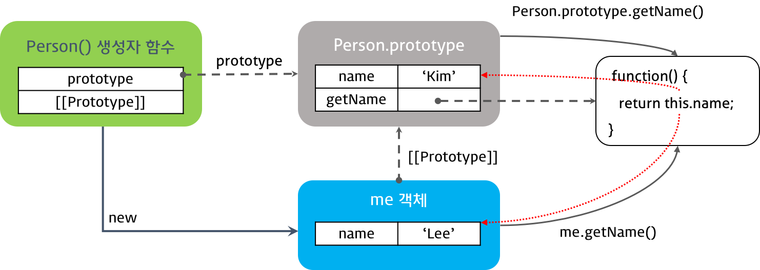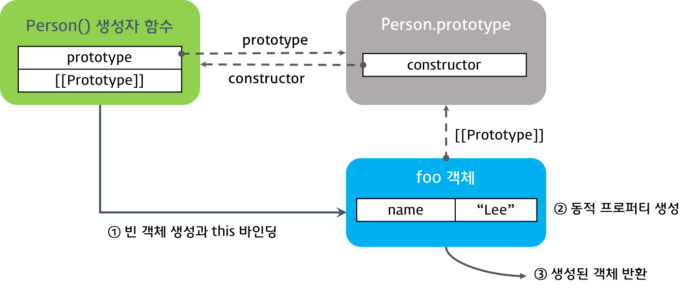 일반함수와 생성자 함수에 특별한 형식적 차이는 없으며 함수에 new 연산자를 붙여서 호출하면 해당 함수는 생성자 함수로 동작한다.