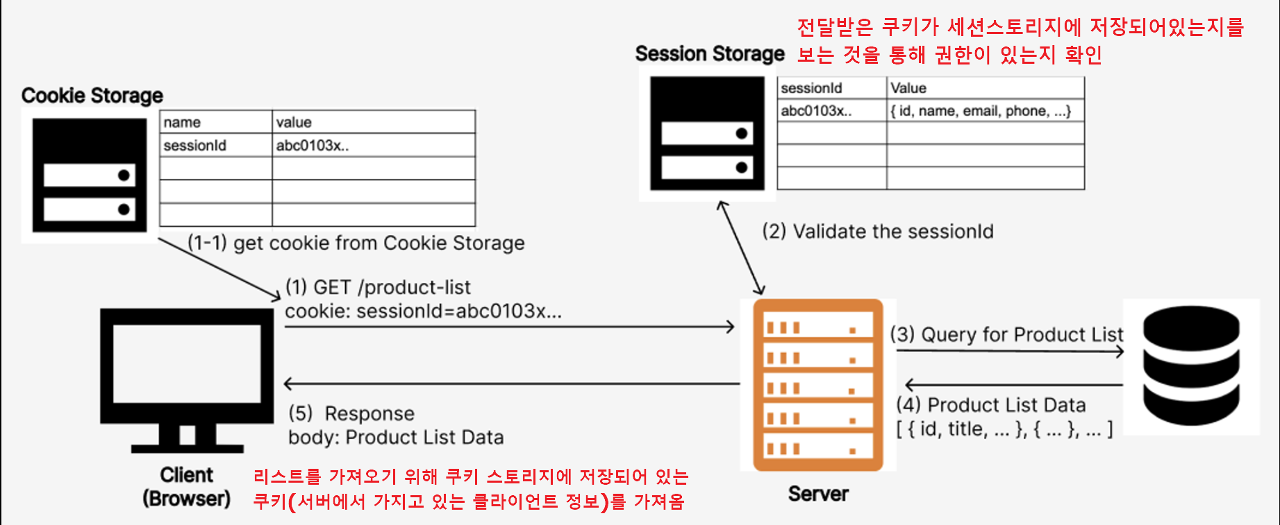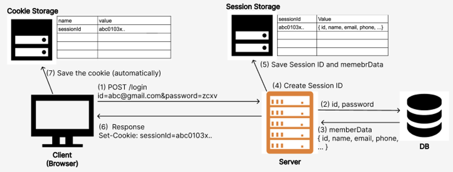 - 서버는 인가가 필요한 API 요청을 받으면 클라이언트 쿠키에 들어 있는 sessionId를 세션 저장소에 조회하여 있으면 DB에 데이터를 조회하여 응답