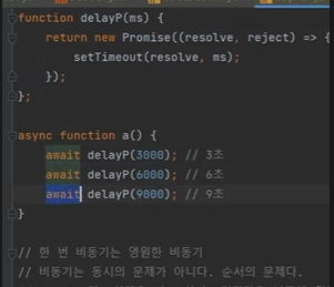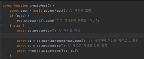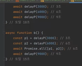 그러니까, promise로 바로 실행 후(await Promise.all([p1,p2])) --> 두개가 동시에 실행됨, 결과값은 나중에 가져오도록 하자