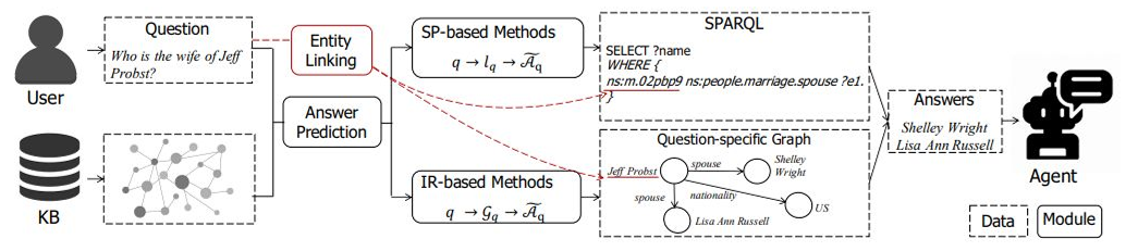 - Knowledge Base(KB)에서의 정보(지식 그래프)를 바탕으로 질문에 대답하는 Knowledge Base Question Answering