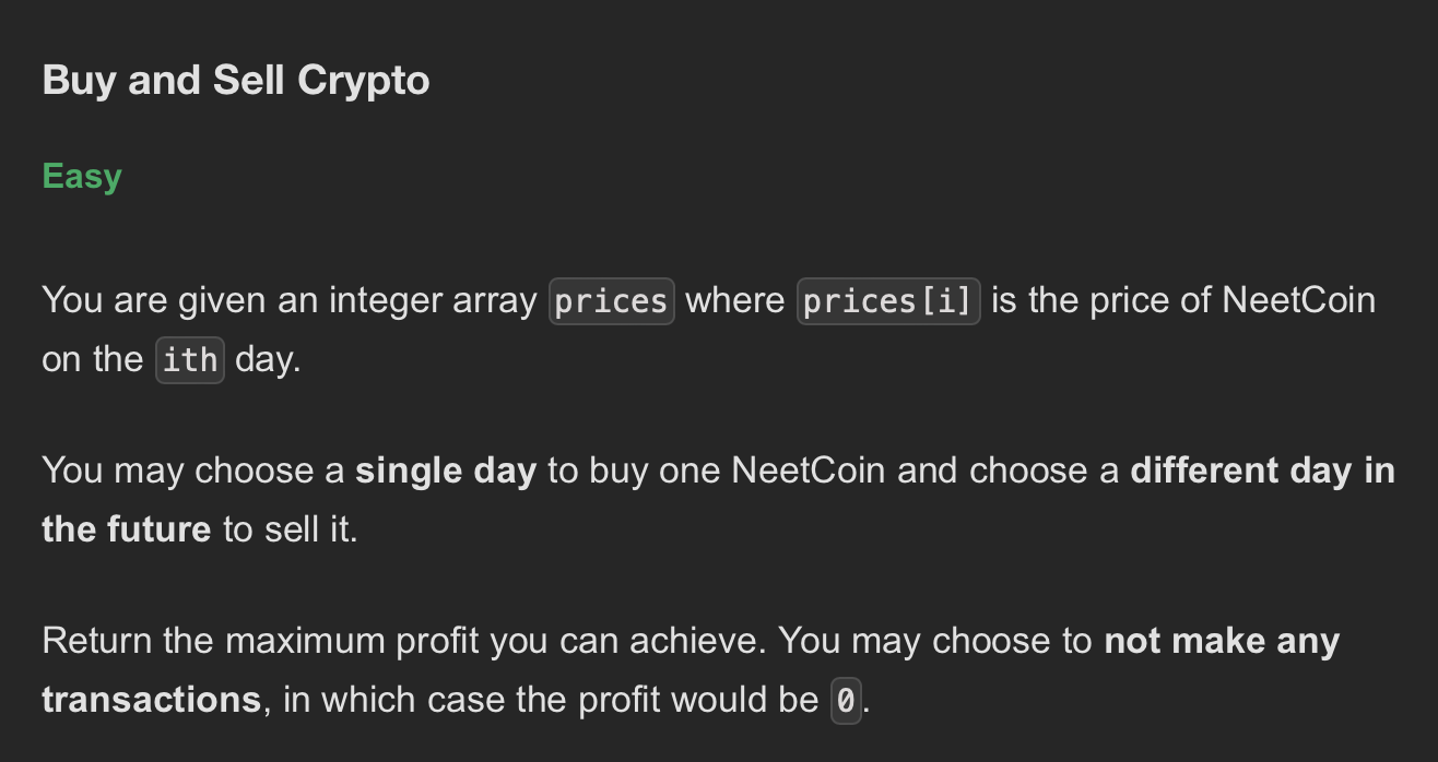 문제 : prices[i]는 i번째날의 neetcoin이다. / 하나의 날을 선택하여 NeetCoin을 구매하고, 그보다 나중의 다른 날을 선택하여 NeetCoin을 팔 수 있다. 얻을 수 있는 최대 이익을 반환한다./ 거래를 하지 않기로 선택할 수도 있으며, 이 경우 이익은 0이 된다.