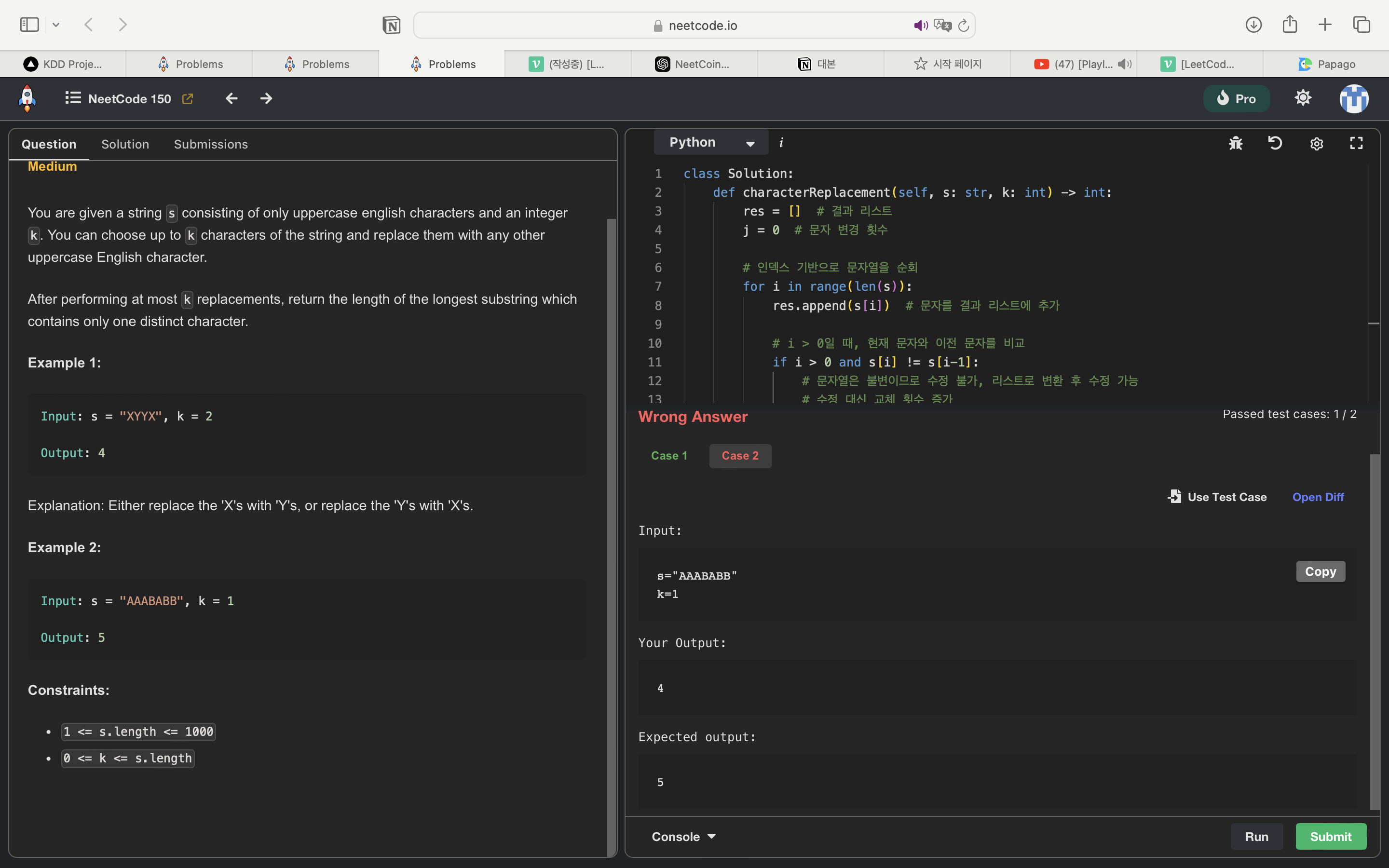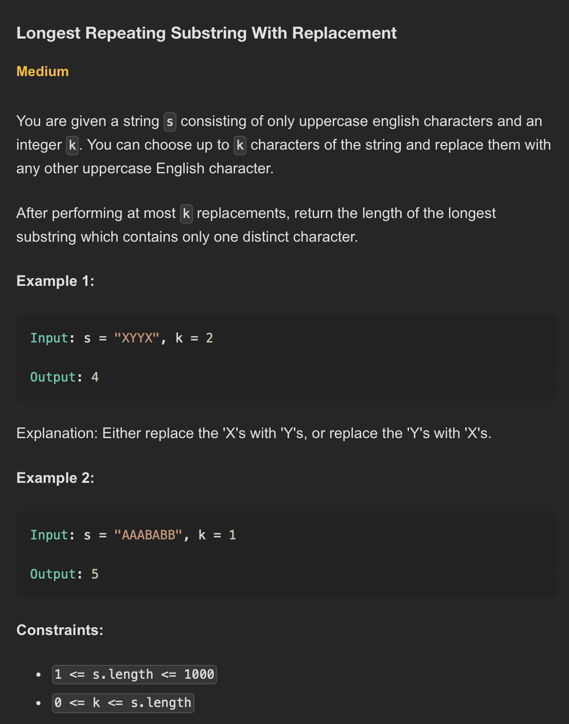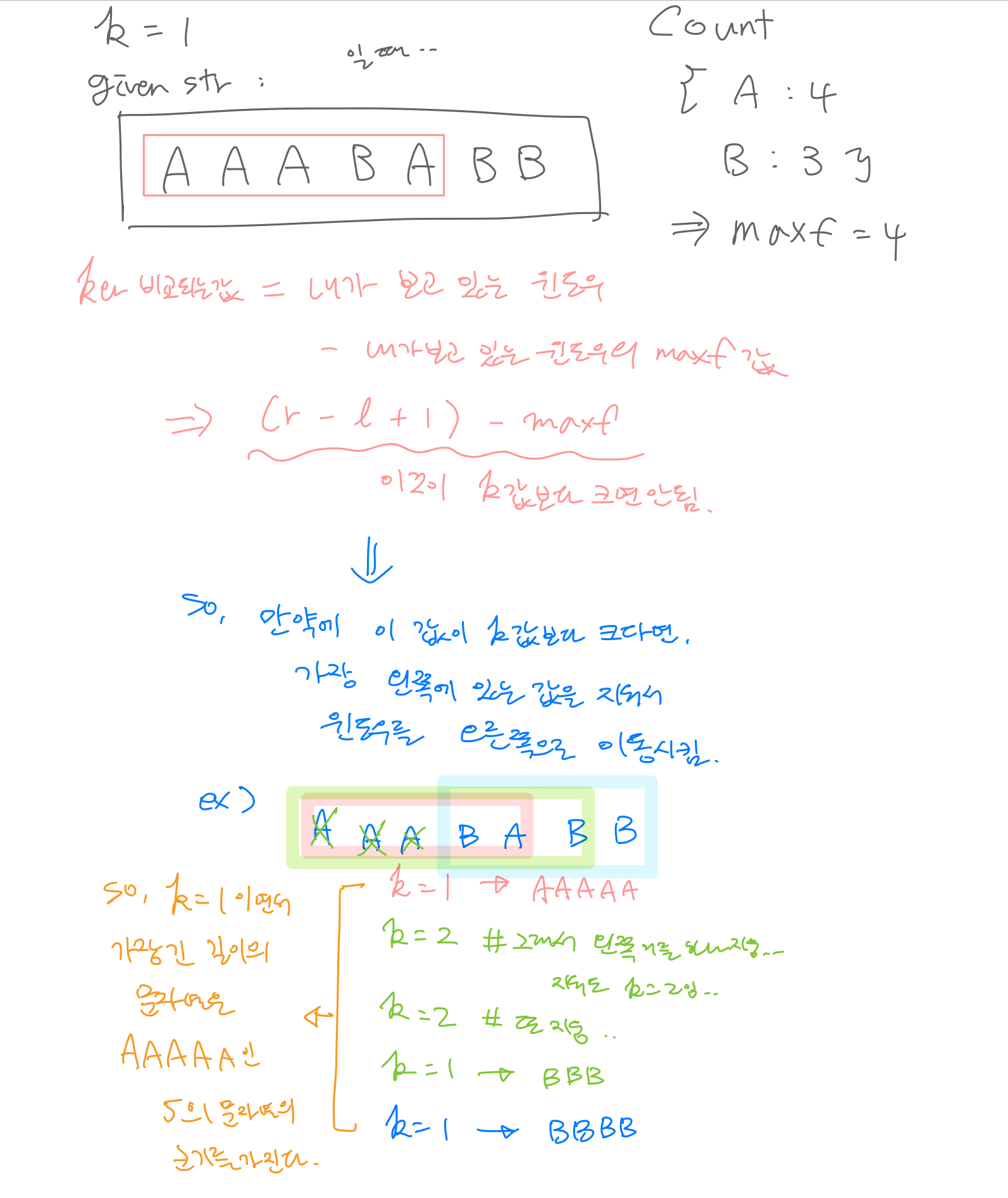 # (현재 윈도우 크기) - (가장 빈도 높은 문자 수) > k 이면 왼쪽 포인터 이동