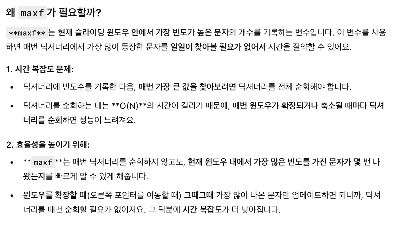 maxf = 0 # 현재 윈도우에서 가장 빈도가 높은 문자 수