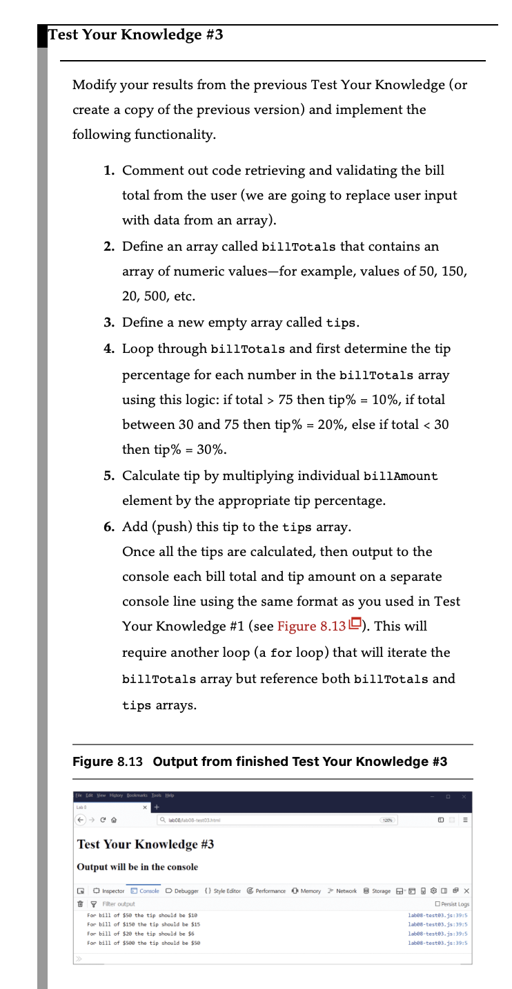 console.log(`For bill of $${billTotals[i]} the tip should be $${tips[i]}`);