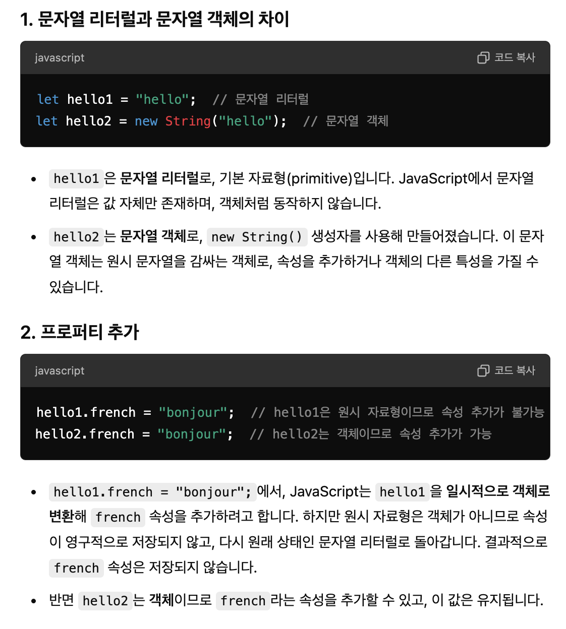 const objName = new Object();와 같이 Object 생성자를 사용해 빈 객체를 생성한 후, 객체에 속성을 추가하는 방식입니다.const obj2 = {};와 같이 리터럴 표기법으로 간단하게 빈 객체를 생성할 수 있습니다.