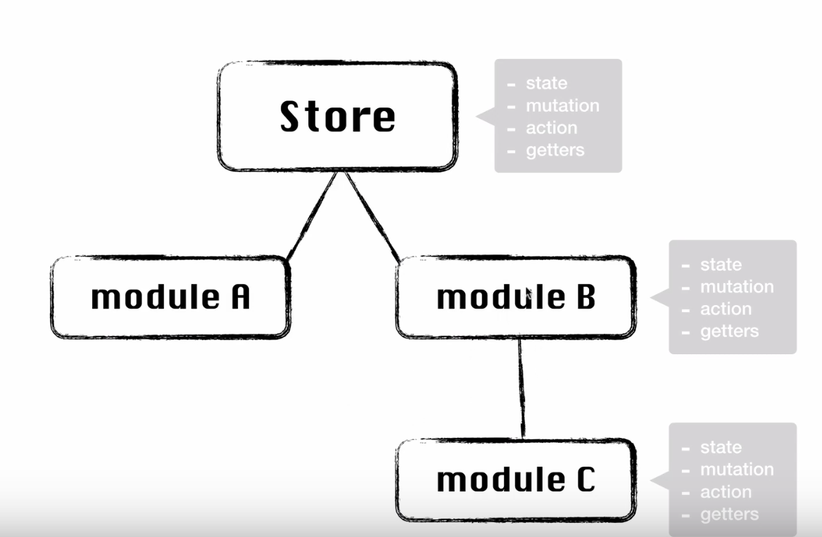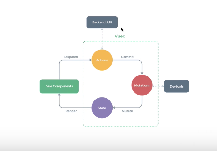ex/ 로그인에 대한 정보를 가져온다면 로그인 버튼이 실행이 되면 Dispatch 가 실행이 되어 Action 에서 password, id 로 서버에 요청을 한다. 서버에 값을 내려주면 commit을 보내준다. Mutation 에서 state 데이터가 변경이 되고 셋 해준다. 이 State 값이 바뀌면 Component는 리렌더링 한다. 모든 Component는 이 하나의 State를 바라볼 수 있다.