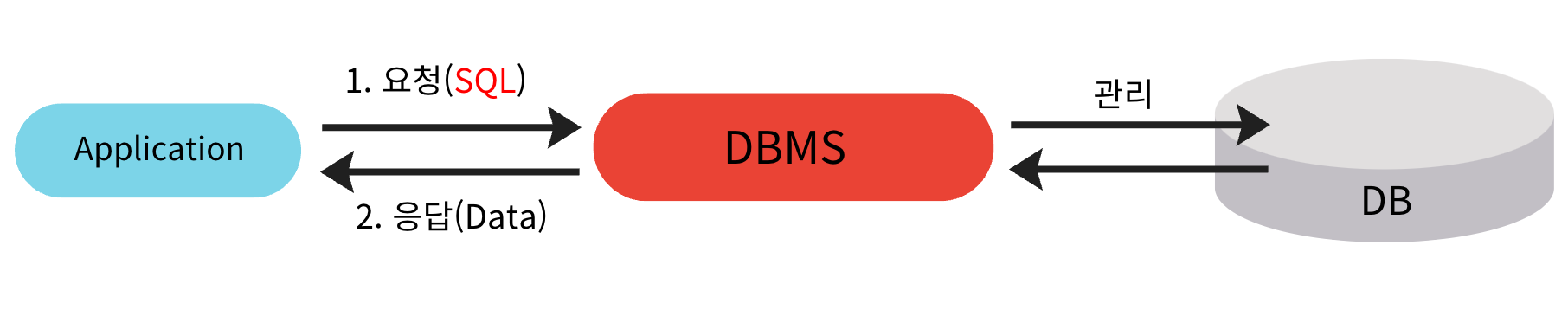 - 효율적인 데이터 관리와 사용을 위해 DBMS(데이터베이스 관리 시스템)을 통해 제어됨