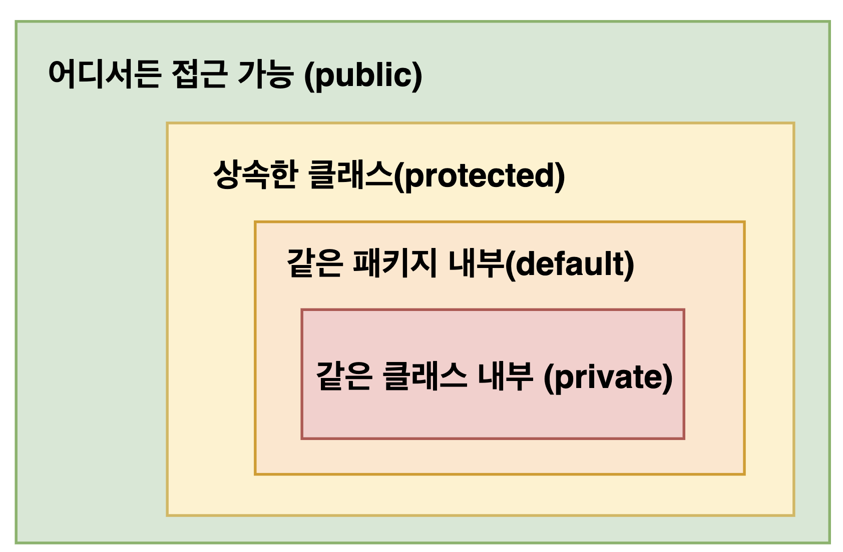protected | 같은 패키지 + 상속받은 클래스에서 접근 가능 | 상속 구조에서 자식에게 열어 줄 때 |