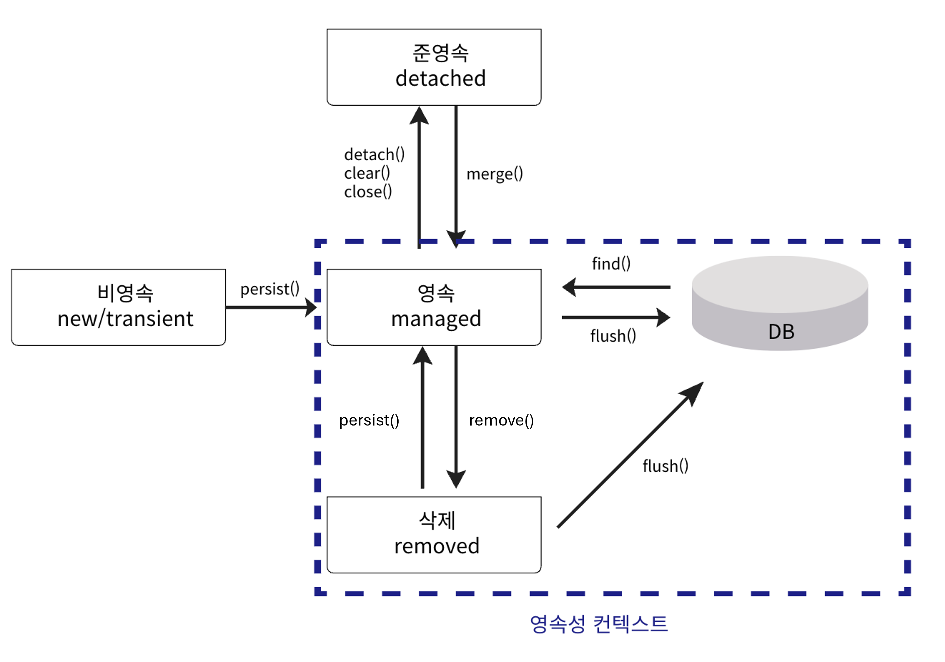 | 🧹 상태 전환 방법 | persist, detach, remove 등으로 상태 변경 |