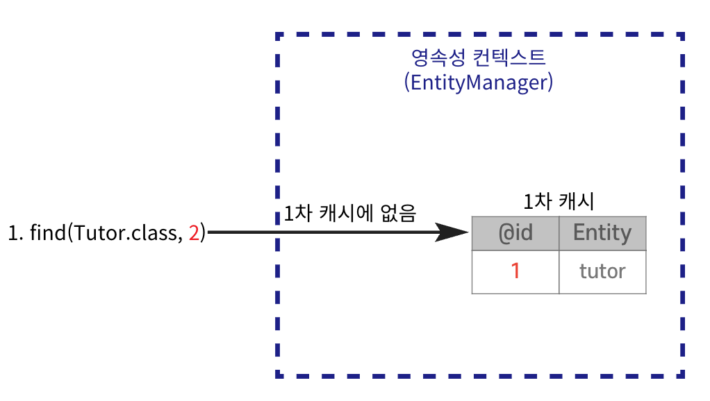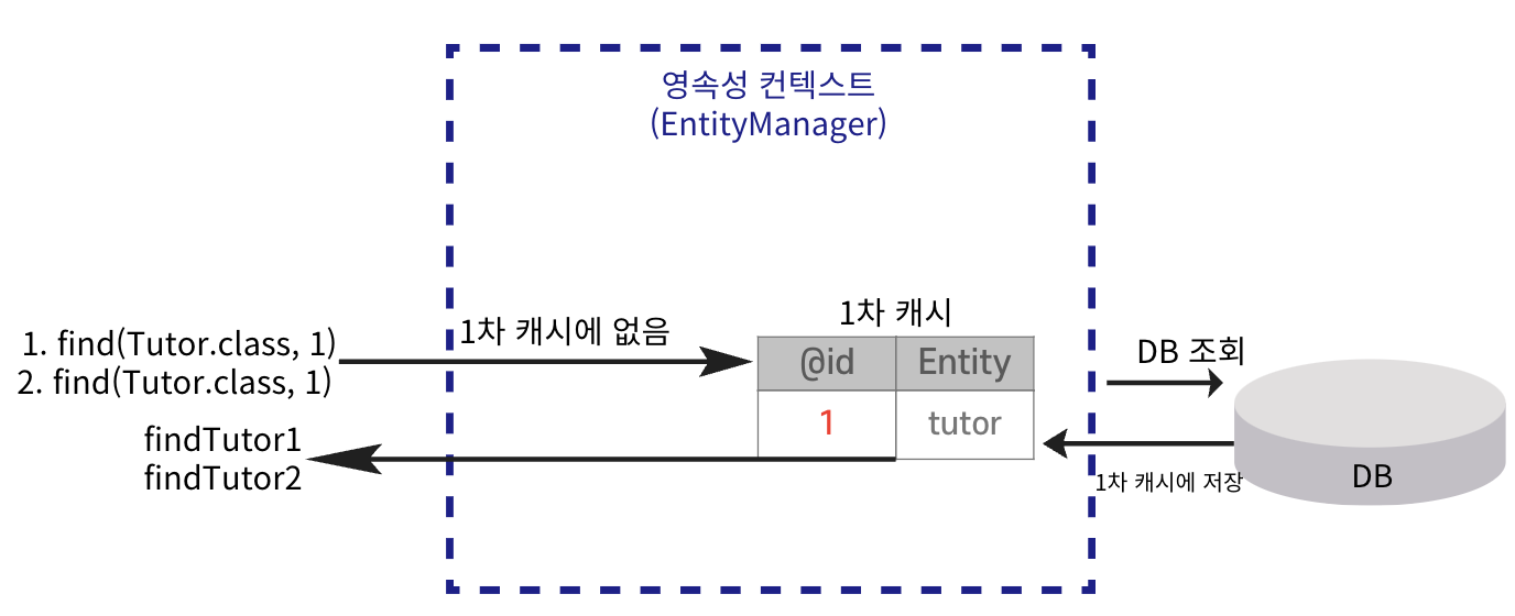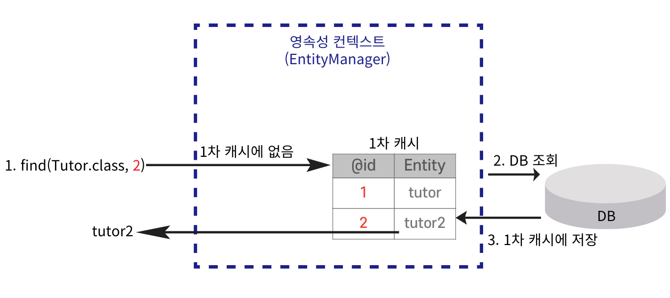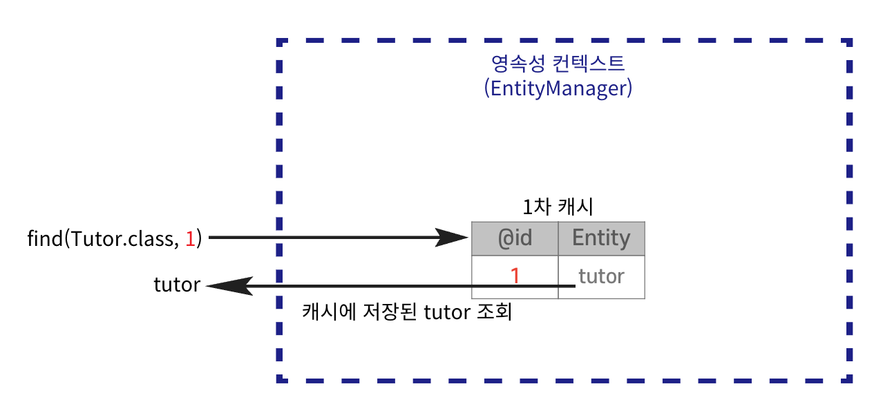 Tutor findTutor = em.find(Tutor.class, 1L); // DB 접근 없이 캐시 조회