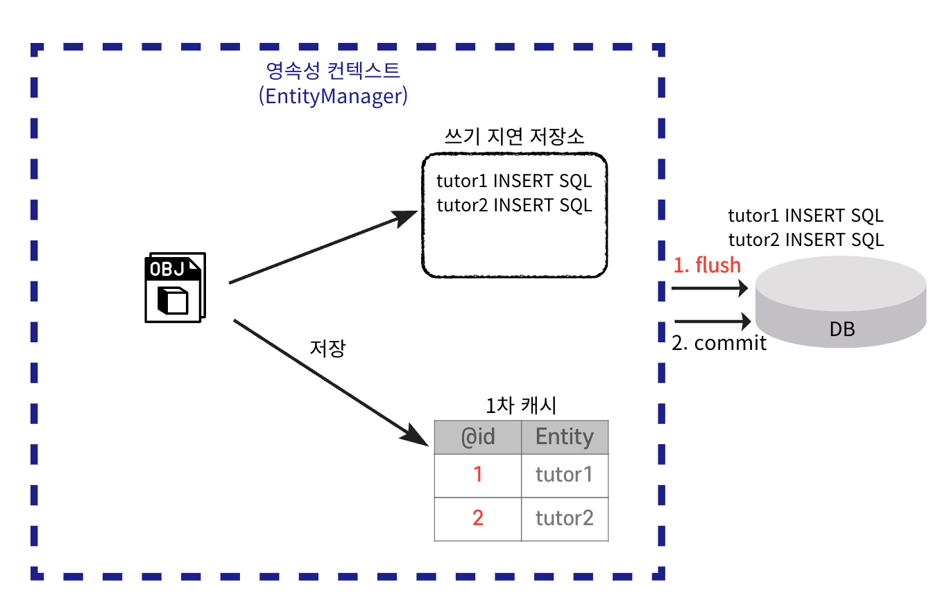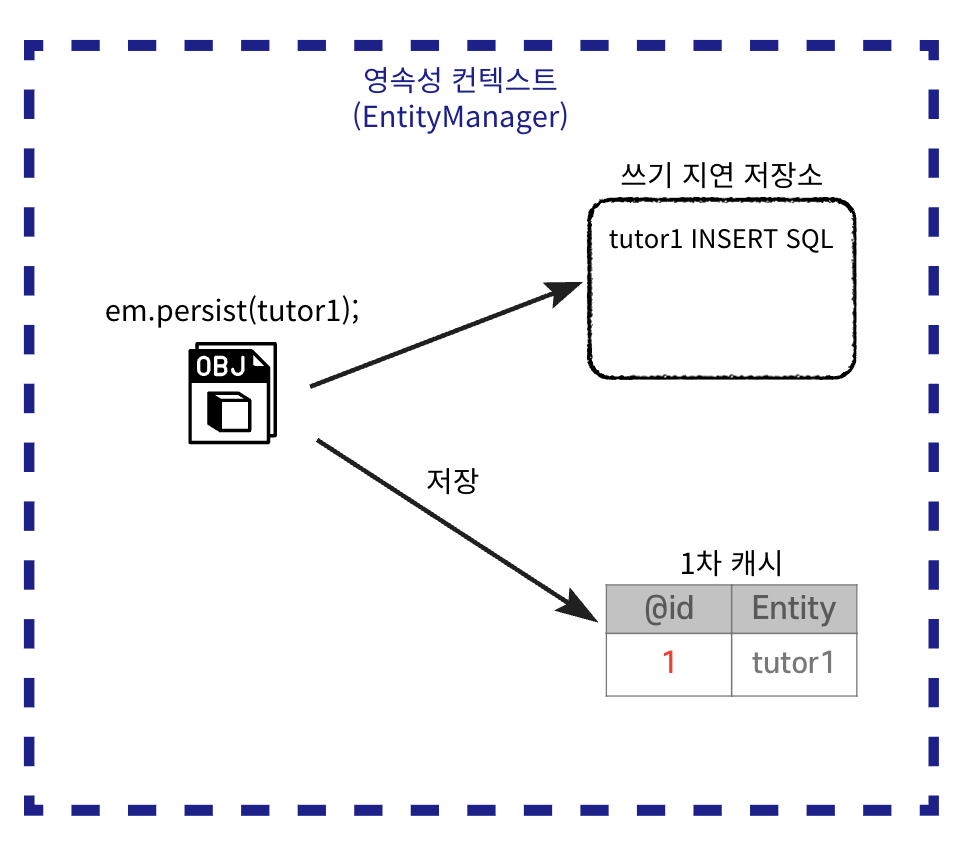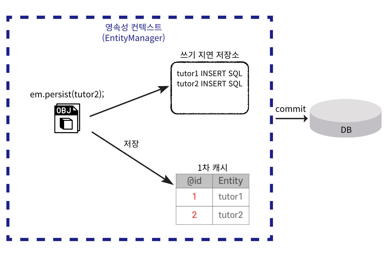 em.persist(tutor1) → 1차 캐시 저장 + INSERT SQL 쓰기 지연 저장소에 저장