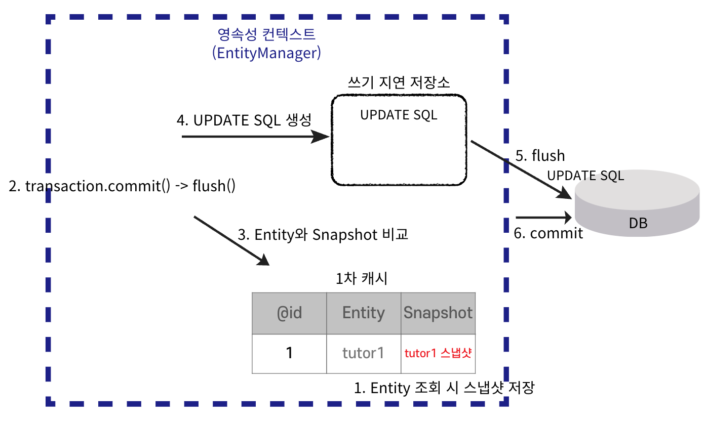 - 영속 상태의 엔티티를 수정하면 JPA가 처음 조회했을 때의 상태(스냅샷) 와 비교하여