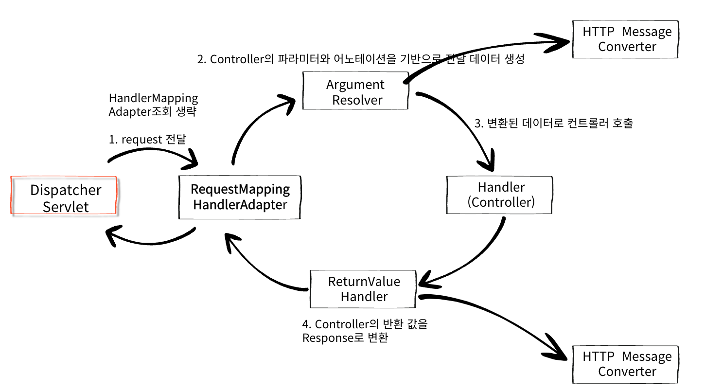 | 주요 처리기 | - RequestResponseBodyMethodProcessor → @RequestBody, @ResponseBody - HttpEntityMethodProcessor → HttpEntity, RequestEntity, ResponseEntity | 두 클래스 모두 HandlerMethodArgumentResolver + HandlerMethodReturnValueHandler 상속 |
