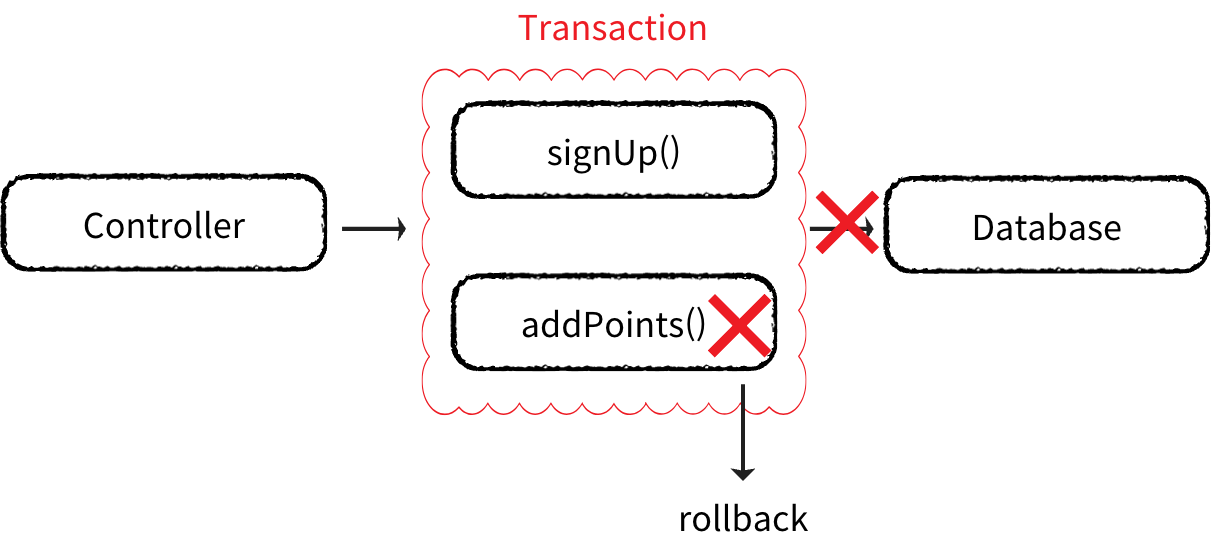 signUp() 에 트랜잭션 시작 → addPoints()도 같은 트랜잭션 사용🚀 트랜잭션 동작