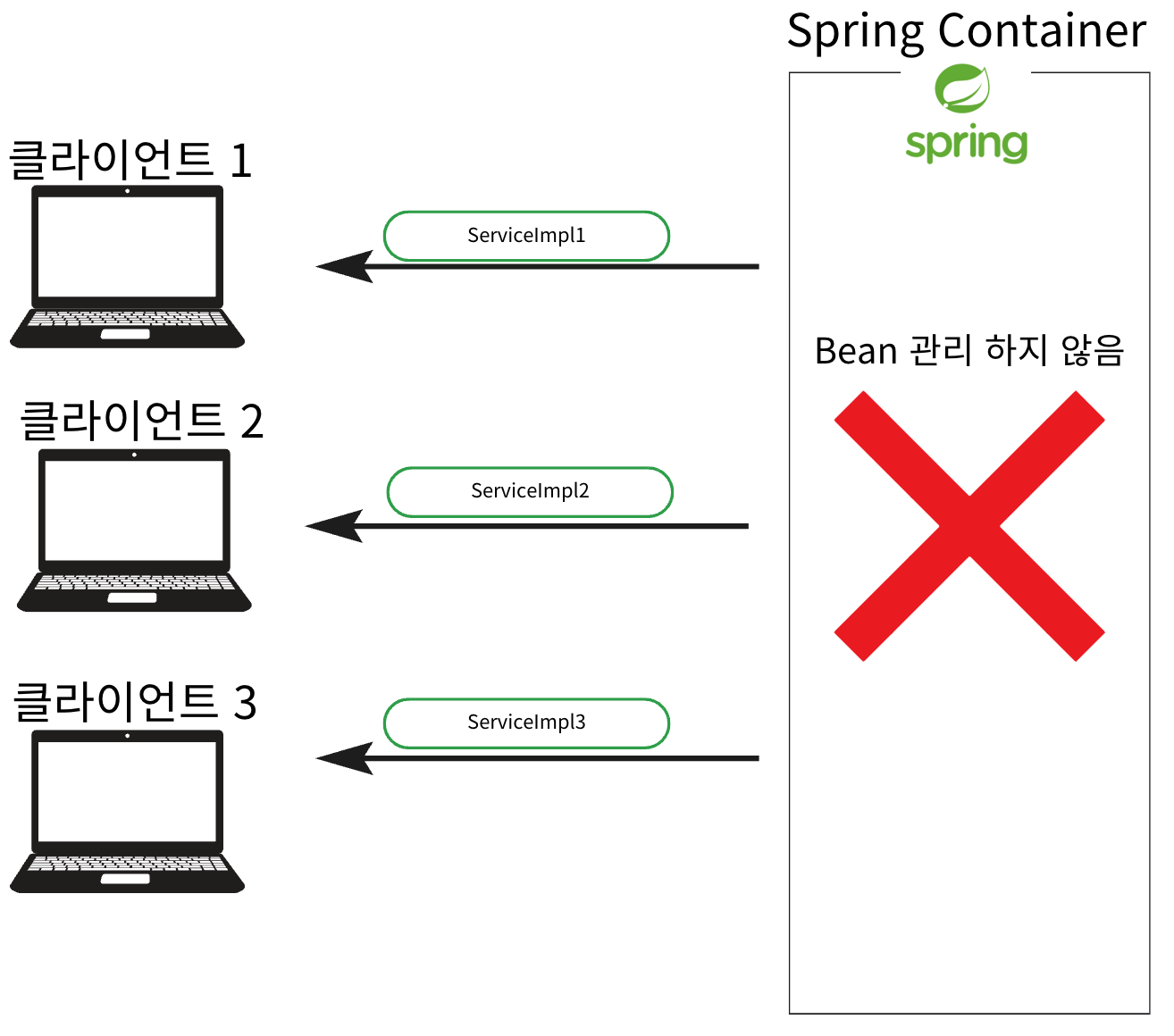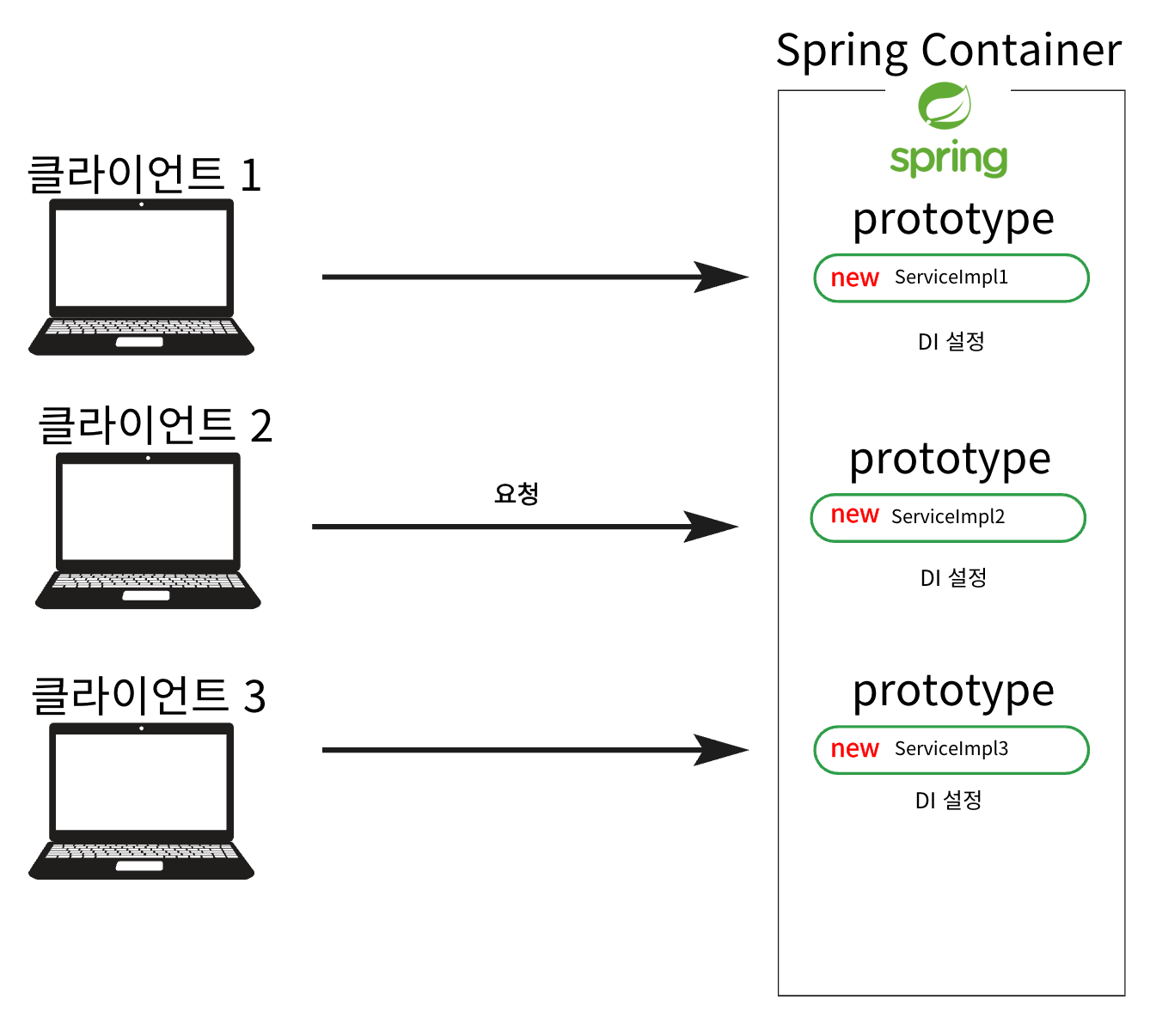 | Prototype | Bean 요청 시마다 생성 | 클라이언트가 직접 관리 | 임시 객체 (상태 있음) | @PreDestroy 실행 안 됨 |