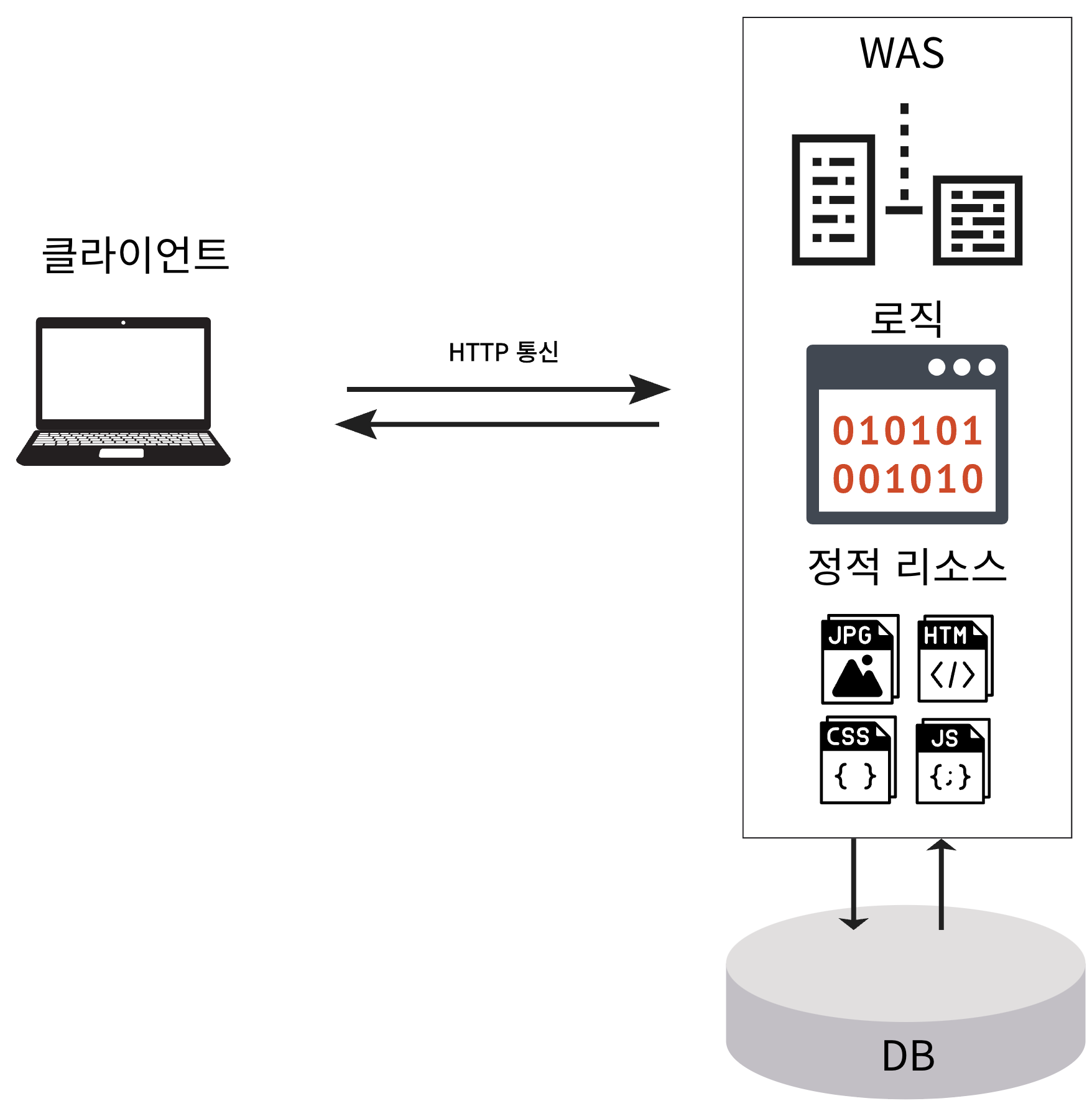 | WAS | 동적 로직 처리, DB 연동 등 비즈니스 로직 수행 |