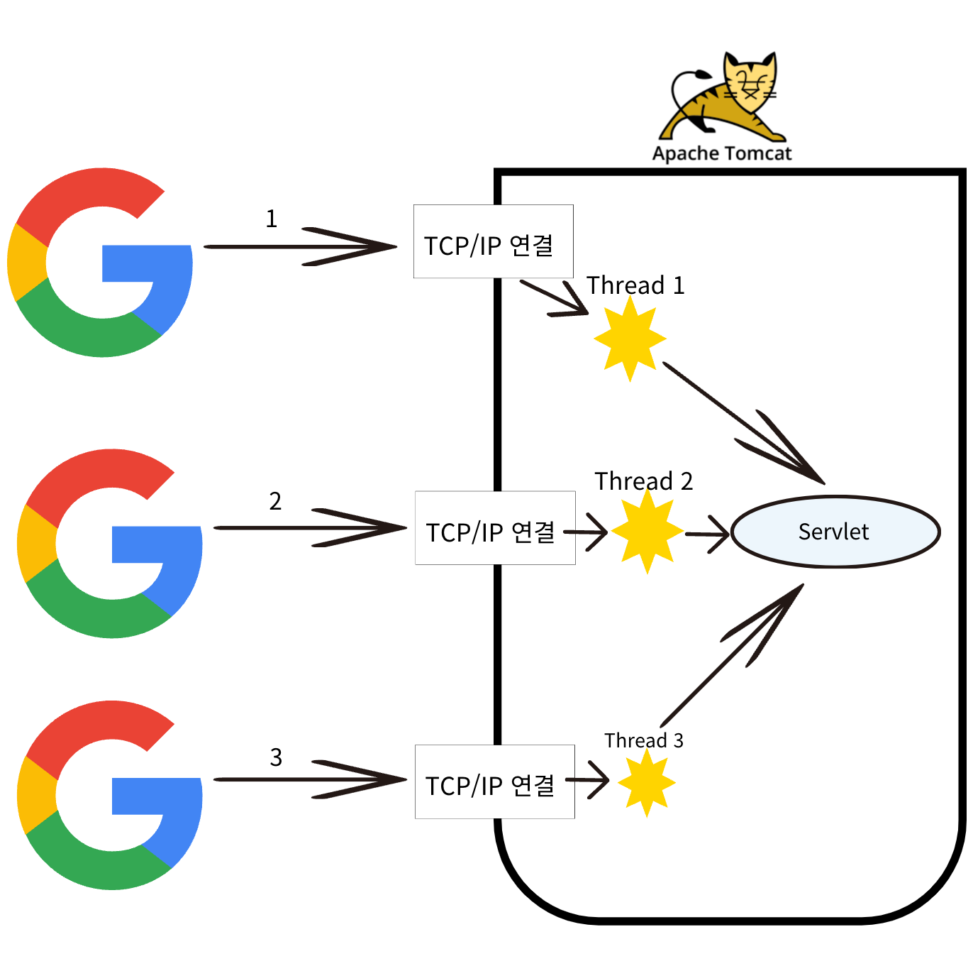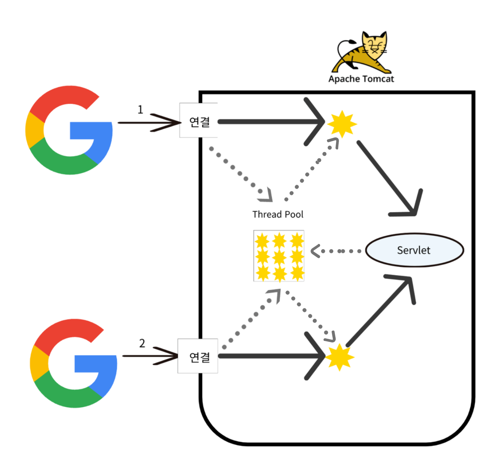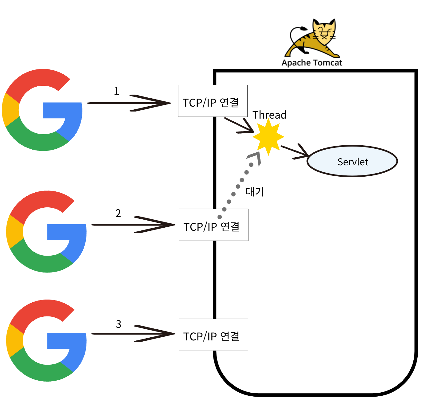 - 요청이 모두 사라질 때까지 (대기 → 작업 수행 → 스레드 반환)작업을 반복