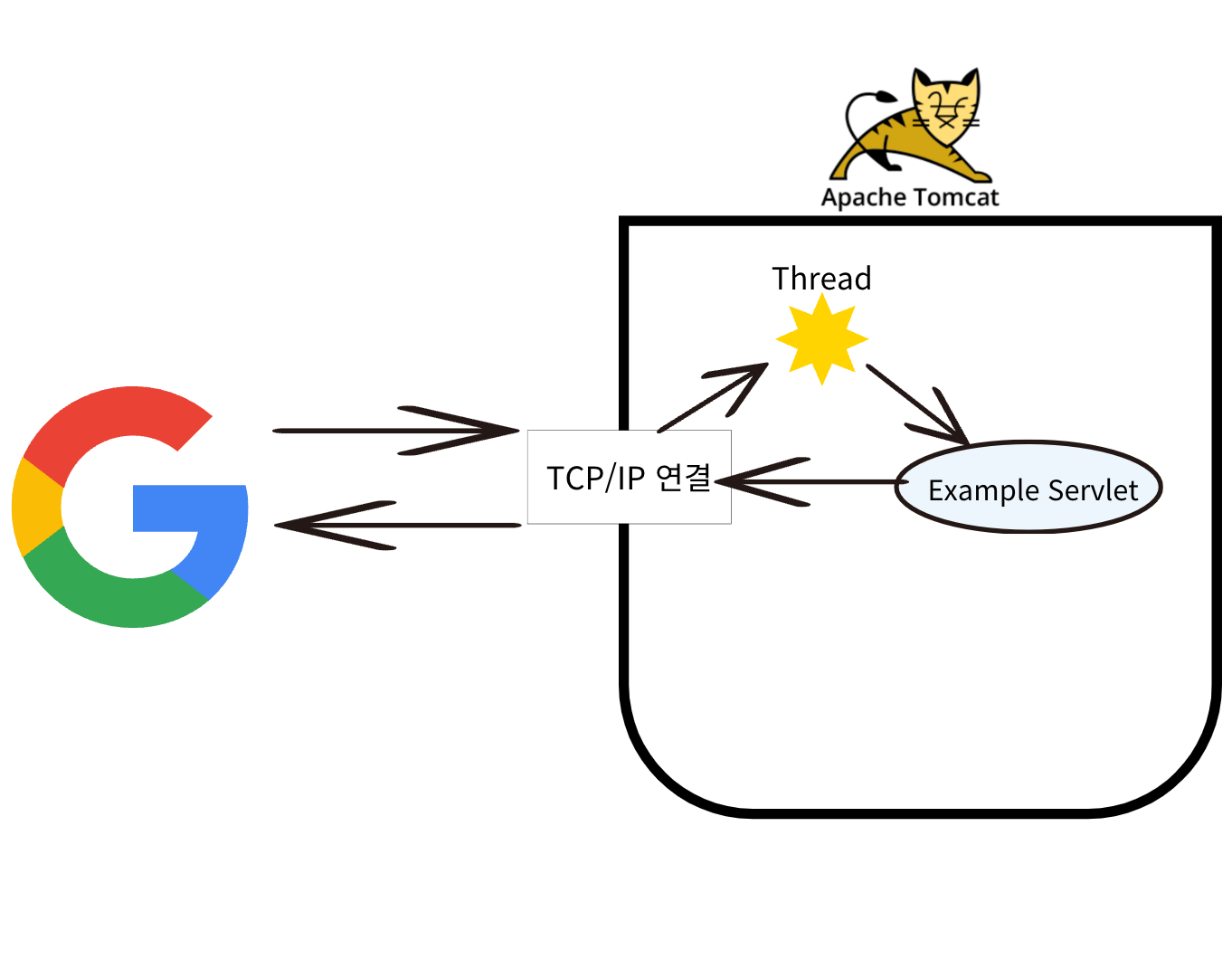 : 클라이언트 요청 → WAS → Thread 할당 → Servlet 호출 → 응답 반환