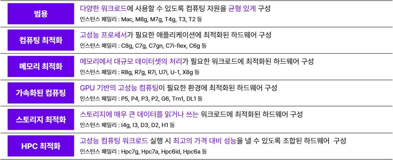 - 컴퓨팅 목적에 맞게 AWS가 미리 구성해둔 하드웨어 자원