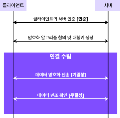 - 연결 수립 후 데이터를 전송할 때, 전송되는 모든 데이터는 합의한 암호화 알고리즘으로 암호화해서 전송(기밀성)