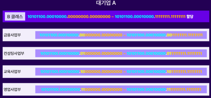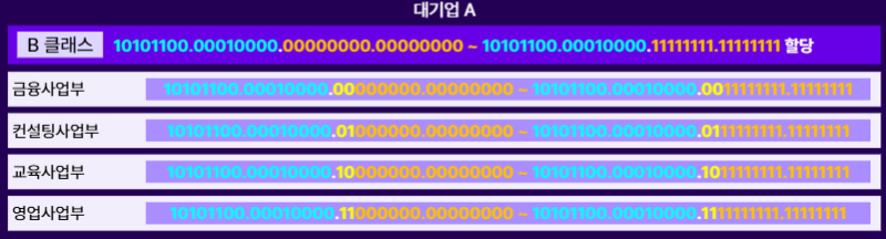 그에 따라 자체적으로 6.5만개의 IP 주소를 한 번 더 각 부서를 기준으로 하여 그룹(=서브넷)으로 세분화하여 사용하기로 함