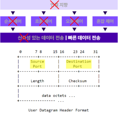 따라서 신뢰성 보장을 위한 여러 통신 과정 제어를 수행할 수 없지만, 이러한 과정이 생략되므로 빠른 속도 보장