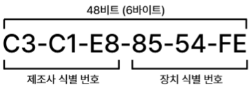 - NIC는 자신만의 고유한 식별자를 가지는데, 이를 MAC 주소 라고 함
