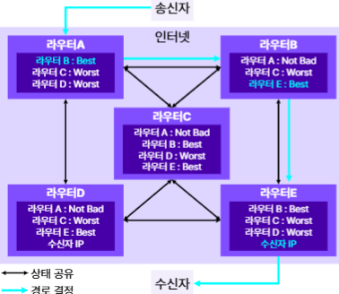 - 이 때, 인접한 라우터의 상태는 라우팅 테이블에 기록되며, 라우팅 테이블의 정보를 바탕으로 라우팅 프로토콜에 의해 최적의 넥스트 홉이 결정