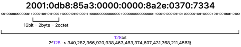 - IPv6 주소는 비트 수를 128bit(IPv4의 4배)로 늘려 가용 IP 주소 개수를 획기적으로 증가 시킴