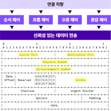 - 오류 제어 : 데이터 유실 및 오류 감지 시 데이터를 다시 전송