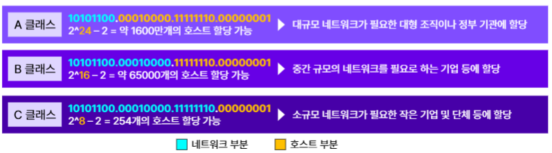 - IP 주소를 네트워크 부분과 호스트 부분으로 나누고, 네트워크 부분의 크기에 따라 A~C 클래스로 나눔