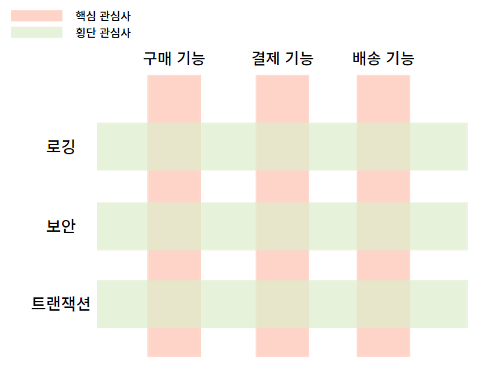 핵심 기능을 보조하기 위해 여러 클래스에 걸쳐 고통으로 사용되는 부가 기능, 코드를 모듈화 시켜 재사용 함으로 중복 코드를 줄인다.