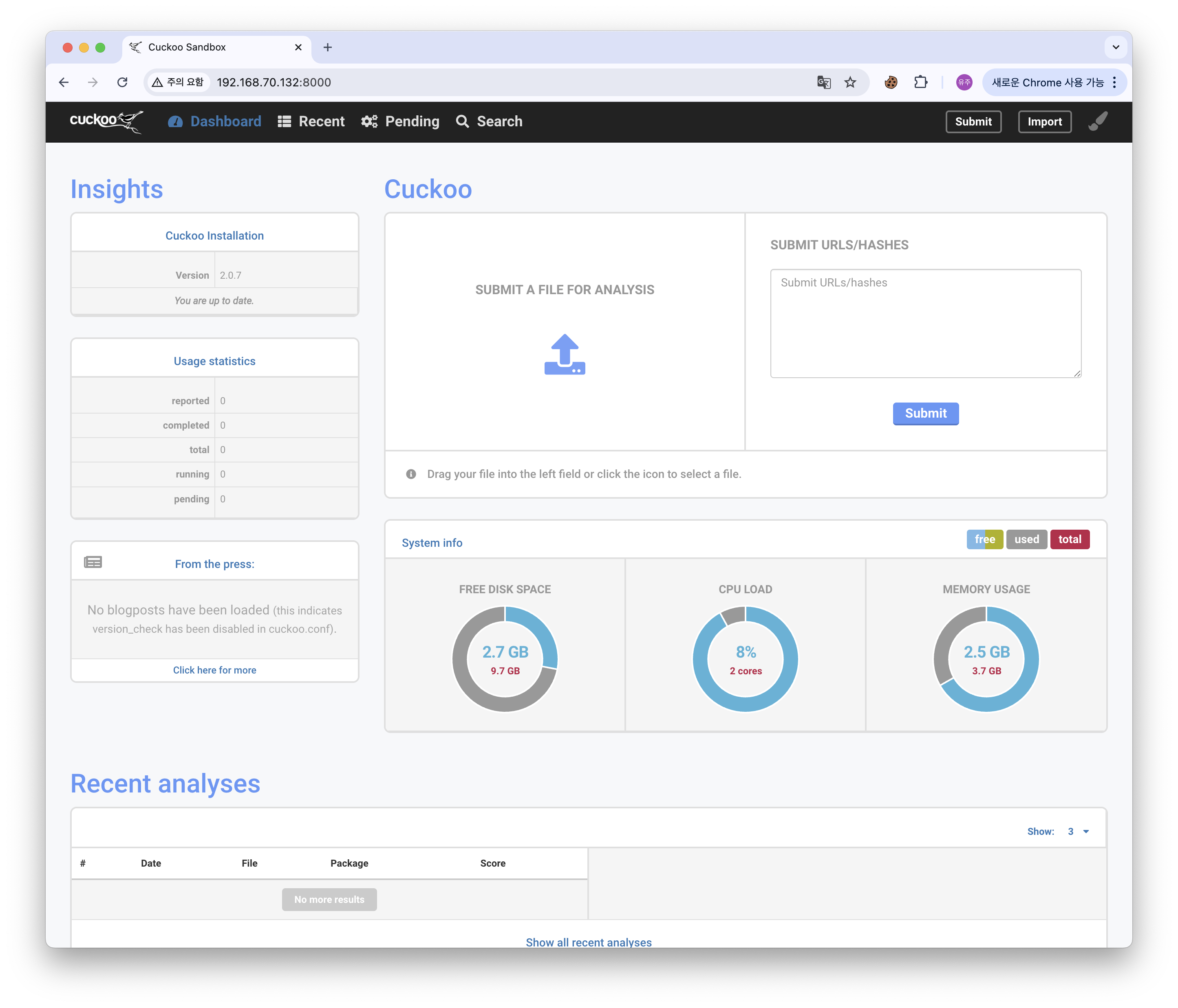 설치가 완료되면 cuckoo init으로 초기화를 진행하고(설정 파일 생성), 웹 서버를 실행하여 대시보드에 접속해 본다.