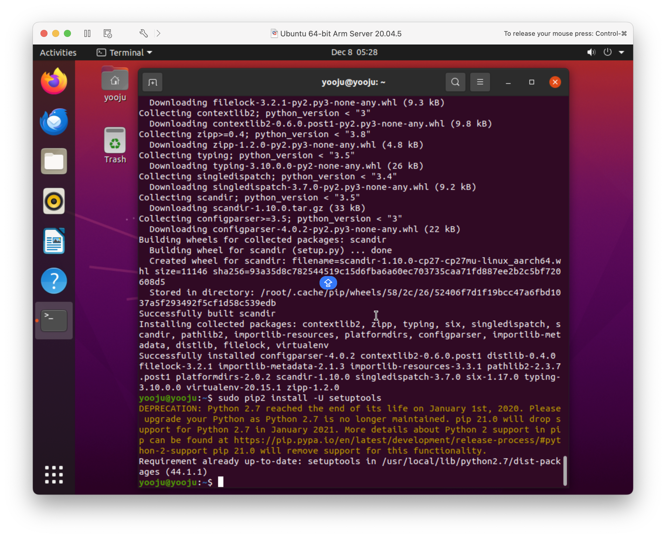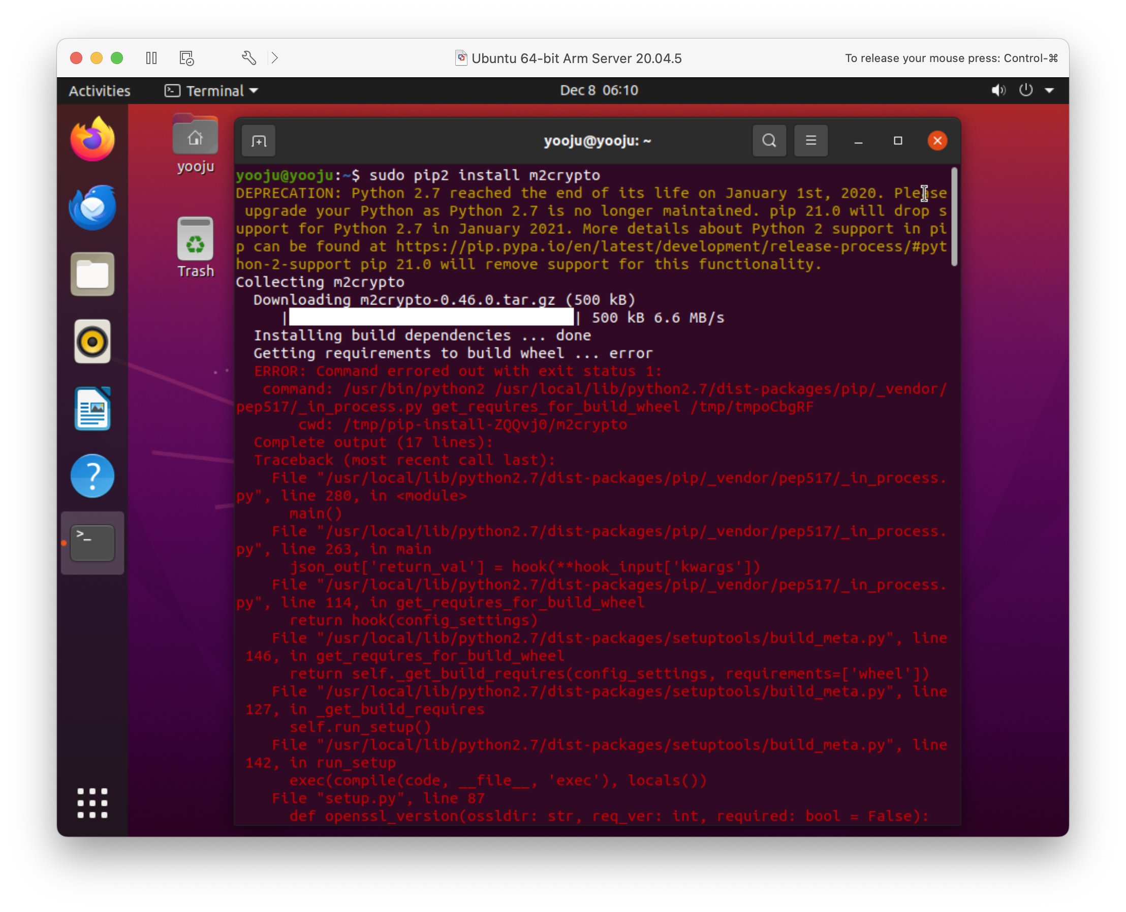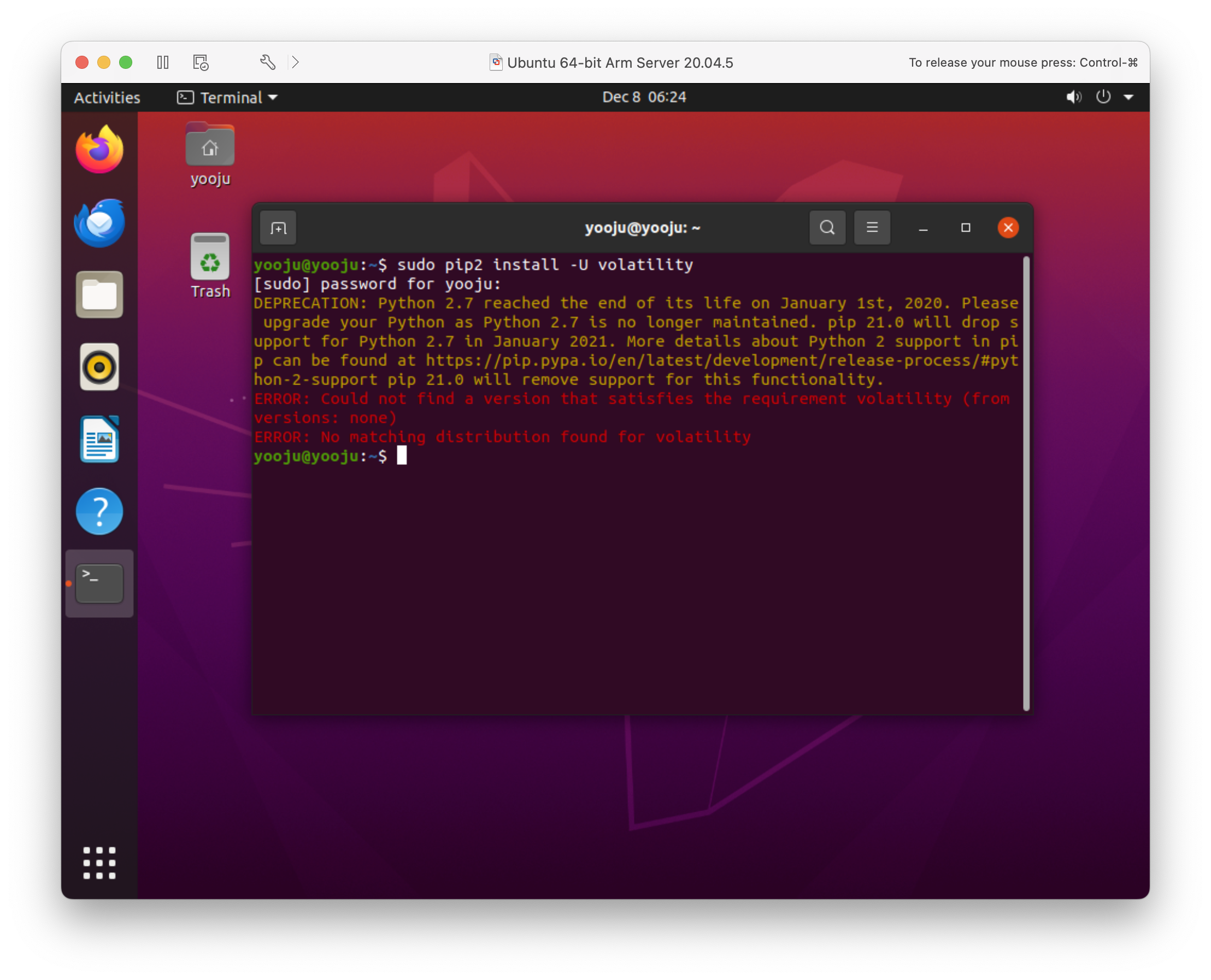 이 부분이 가장 까다로웠다. M2crypto, Volatility 등을 설치할 때 ARM 아키텍처 특성상 컴파일 에러가 계속 발생했다.