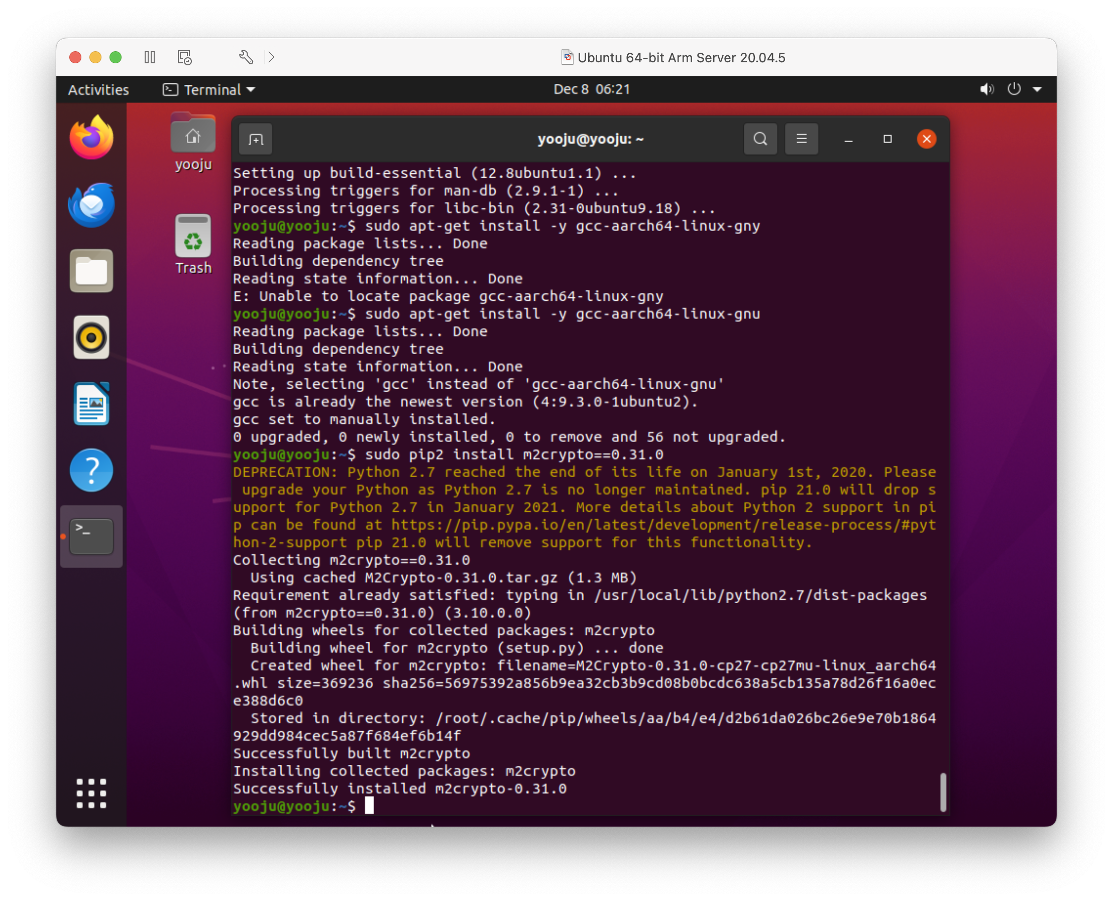aarch64-linux-gnu-gcc 파일을 설치해 주고, m2crypto 버전을 지정해서 설치했더니 성공했다.