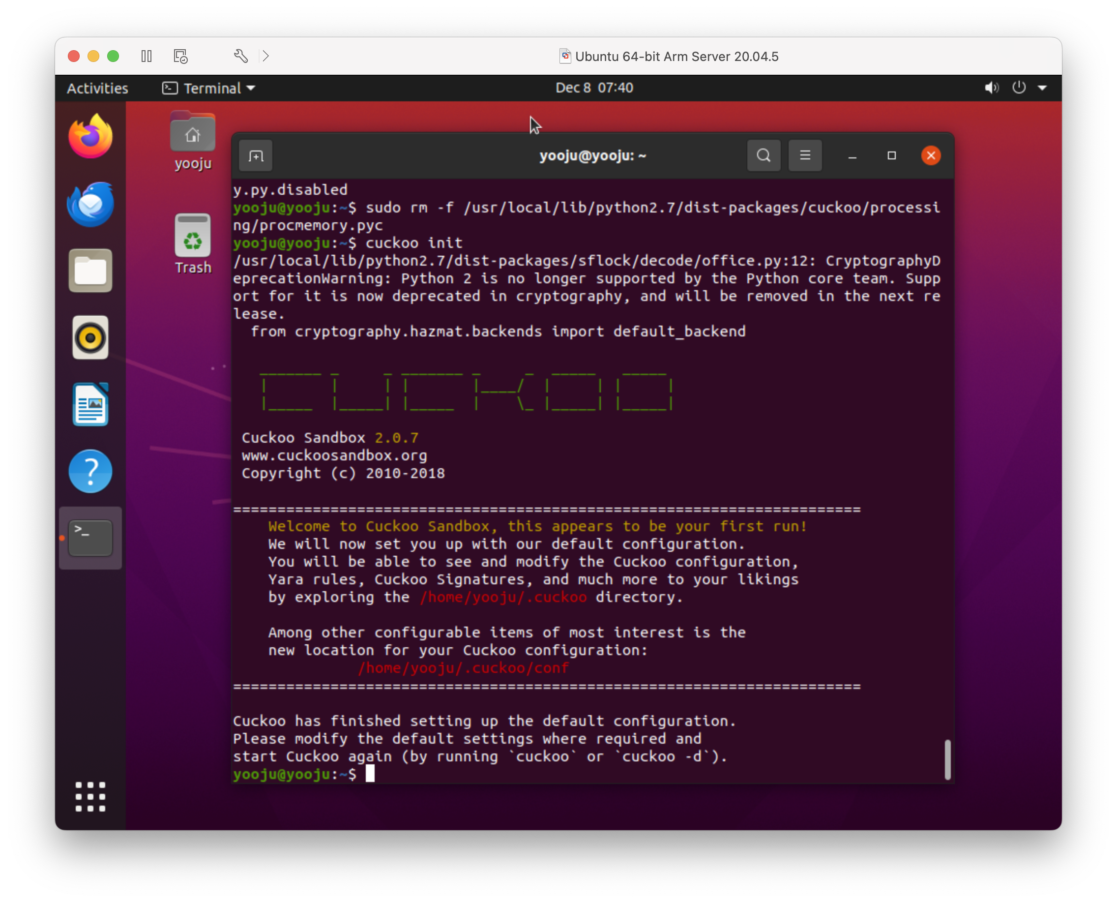 M4 맥북(ARM 아키텍처) 가상 환경(Ubuntu 20.04)에서 오픈소스 악성코드 분석 도구인 Cuckoo Sandbox를 구축하는 과정을 정리합니다.