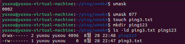 ๐ก umask์ ํ์ฌ ๊ฐ์ ํ์ธํ๊ณ , ์ค์ ๊ฐ์ 077๋ก ๋ณ๊ฒฝ ํ, ์๋ก์ด ํ์ผ ping3.txt์ ์๋ก์ด ๋๋ ํ ๋ฆฌ ping123์ ๋ง๋ค์ด์ ์์ฑ๋ ํ์ผ๊ณผ ๋๋ ํ ๋ฆฌ์ ๊ธฐ๋ณธ์ผ๋ก ๋ถ์ฌ๋ ๊ถํ์ ํ์ธํ์์ค.