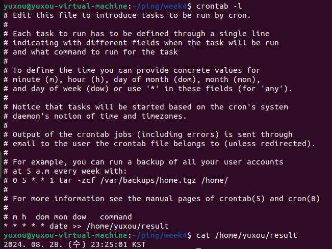๐ก ๊ฐ๋จํ ๋ฉ์์ง๋ฅผ ํฌํจํ๋ ํ์ผ /home/user1/message์ ๋ง๋ค๊ณ , date >> result ๋ช ๋ น์ด๋ฅผ ๋งค 1๋ถ๋ง๋ค ์ํํ๋ crontab ์ ์์ฑํ์ฌ ์คํ ๊ฒฐ๊ณผ๋ฅผ ํ์ธํ์์ค.