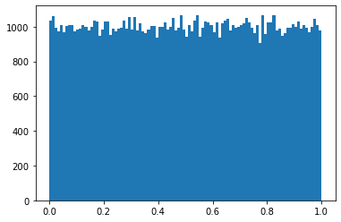 # ndarray를 만드는 방법! # np.array(), np.ones(), np.zeros(), np.full(), np.empty() # np.ones_like(), np.zeros_like(), np.full_like(), np.empty_like() # np.arange(), np.linspace() # 랜덤값을 이용해서 ndarray를 만들어 내는 방법 - 5개의 함수가 있어요!! # np.random.normal(), np.random.rand(), np.random.randn(), np.random.randint(), np.random.random() # np.random이라는 패키지안에 normal()이란 함수가 있다! # np.random.normal() : ndarray를 만듦, 그런데 그안에 데이터는 난수로 채움! # 정규분포 실수 표본을 추출 # 평균, 표준편차값이 필요! # 일단 난수를 추출하고 그 난수가 정규분포를 따르는지 확인! import numpy as np import matplotlib.pyplot as plt # 차트 그리는 녀석임 # matplotlib 요 녀석을 설치해주도록 하자 # anaconda 가상환경에 conda install matplotlib 통해 설치를 해주자! # mean = 50 # 평균 # std = 2 # 표준편차 # 1번째 # arr = np.random.normal(mean, # std, # (100000,)) # 3번째 인자는 shape # print(arr) # 그래프로 나타내보자 bins이라는 간격안에 최솟값과 최대값을 가지고 100개의 영역을 나눠 그래프로 그림 # plt.hist(arr,bins=100) # plt.show() # 2번째 # np.random.rand() : ndarray를 만듬 그런데 그안에 데이터는 난수로 채움! # [0,1) 0부터 1사이 (0은 포함, 1은 불포함)의 실수형 난수를 # 균등분포에서 추출한 후 ndarray를 생성 # 데이터의 편향을 없애기 위해 위 방식처럼 난수를 추출함 # 무조건 0~1사이의 데이터를 뽑음 # arr = np.random.rand(1000000) # print(arr) # plt.hist(arr,bins=100) # plt.show() # 3번째 # np.random.randn() : ndarray를 만듬 그런데 그안에 데이터는 난수로 채움! # 표준정규분포에서 난수를 추출 # (정규분포에서 평균이0이고 표준편차가 1인 정규분포를 표준정규분포라 함) # arr = np.random.randn(100000) # print(arr) # plt.hist(arr,bins=100) # plt.show() # 특정분포를 따르는 난수들을 함수를 통해서 뽑을 때 원하는 형태로 만들어 낼 수 있다 라고 심플하게 생각해보도록 하자! # 4번째 # np.random.randint() : ndarray를 만듬 그런데 그안에 데이터는 난수로 채움! # 균등분포에서 정수형 난수를 추출 low와 high값을 줘야함 # 정수형 난수 추출하는구나! 라고 이해하도록하자 # arr = np.random.randint(1, 100, (100000,)) # print(arr) # plt.hist(arr,bins=100) # plt.show() # np.random.random() : ndarray를 만들어요, 그런데 그안에 데이터는 난수로채움 # 균등분포에서 실수형 난수를 추출 # 범위는 [0, 1) 사이에서 난수를 추출 # np.random.random(shape) arr = np.random.random((100000,)) print(arr) plt.hist(arr,bins=100) plt.show()