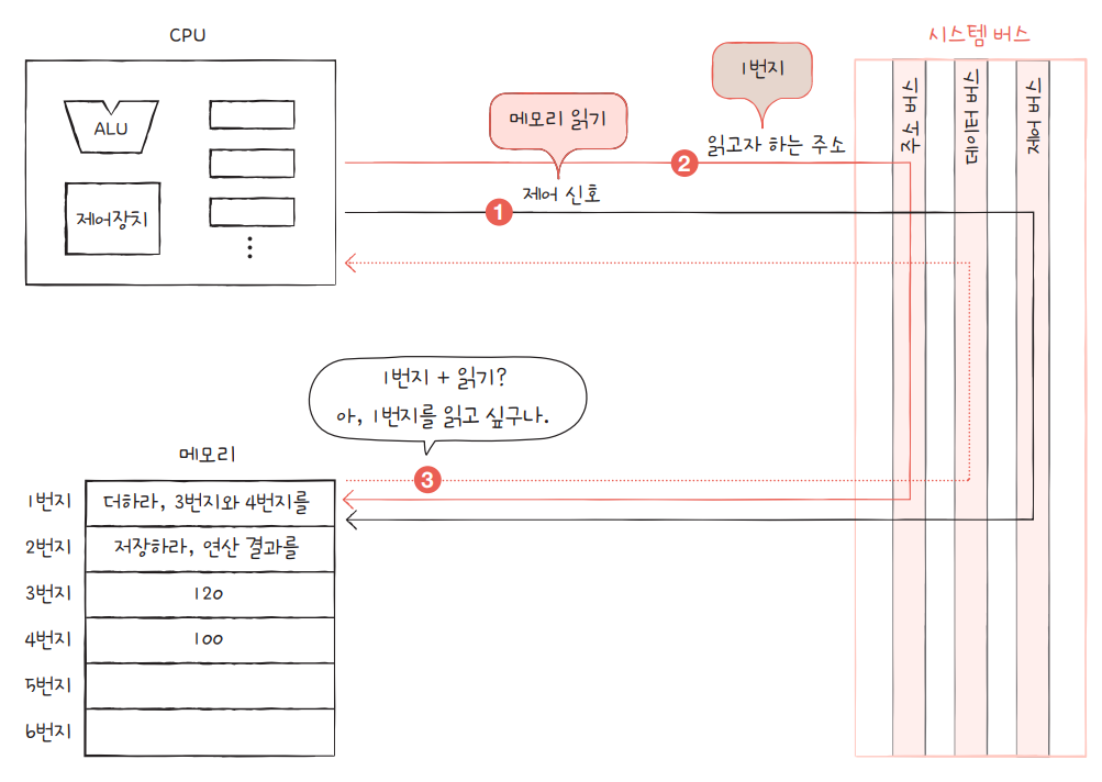 주소 버스를 통해 메모리 읽기를 실행할 '1번 주소' 라는 주소 데이터가 전달된다.