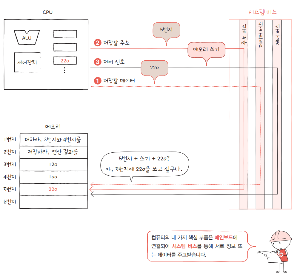 주소 버스를 통해 메모리 쓰기를 실행할 '5번 주소' 라는 주소 데이터가 전달된다.