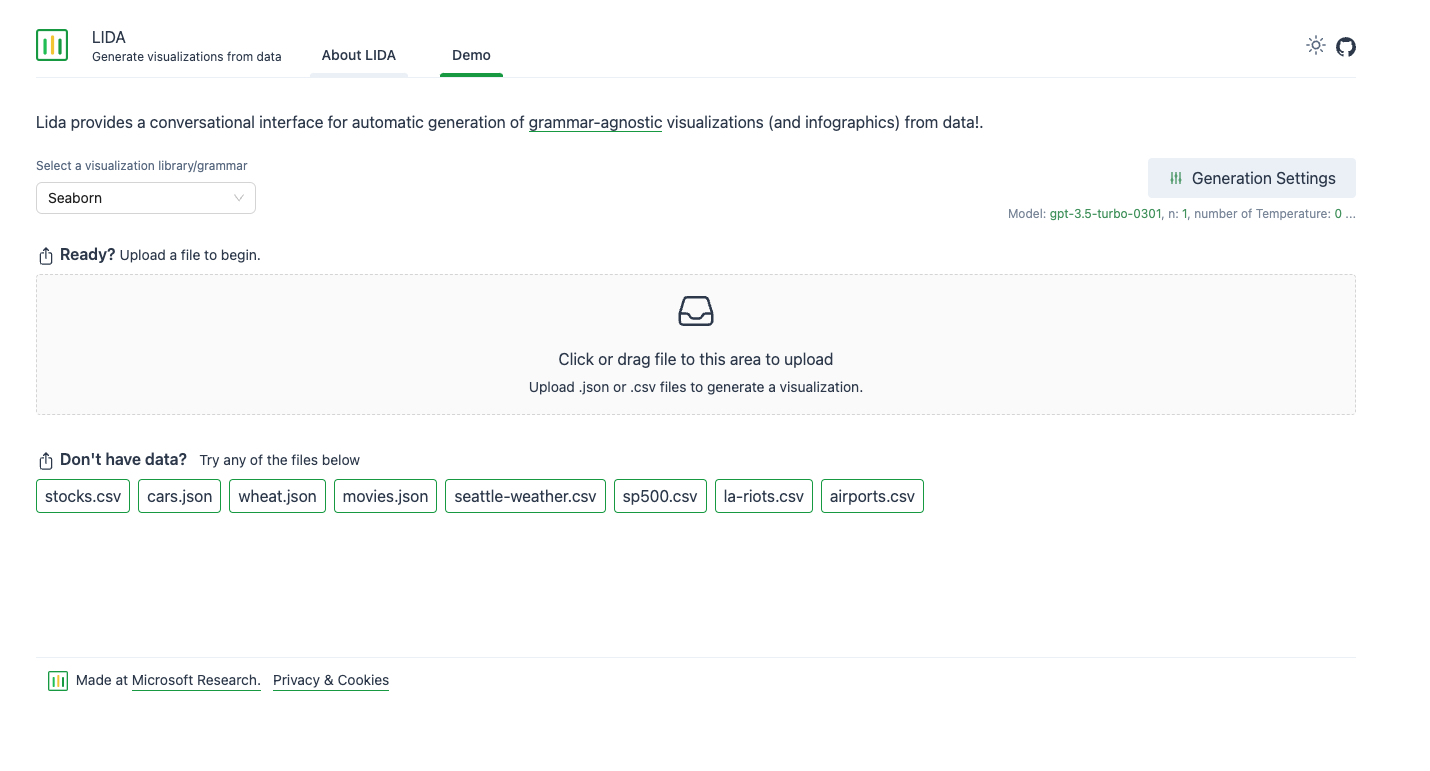 DEMO 버전이 실행되었다면 보유하고있는 json, csv 파일을 업로드 하고, LIDA에서 제공하는 4가지 모듈 기능들을 자유롭게 활용해 볼 수 있습니다.